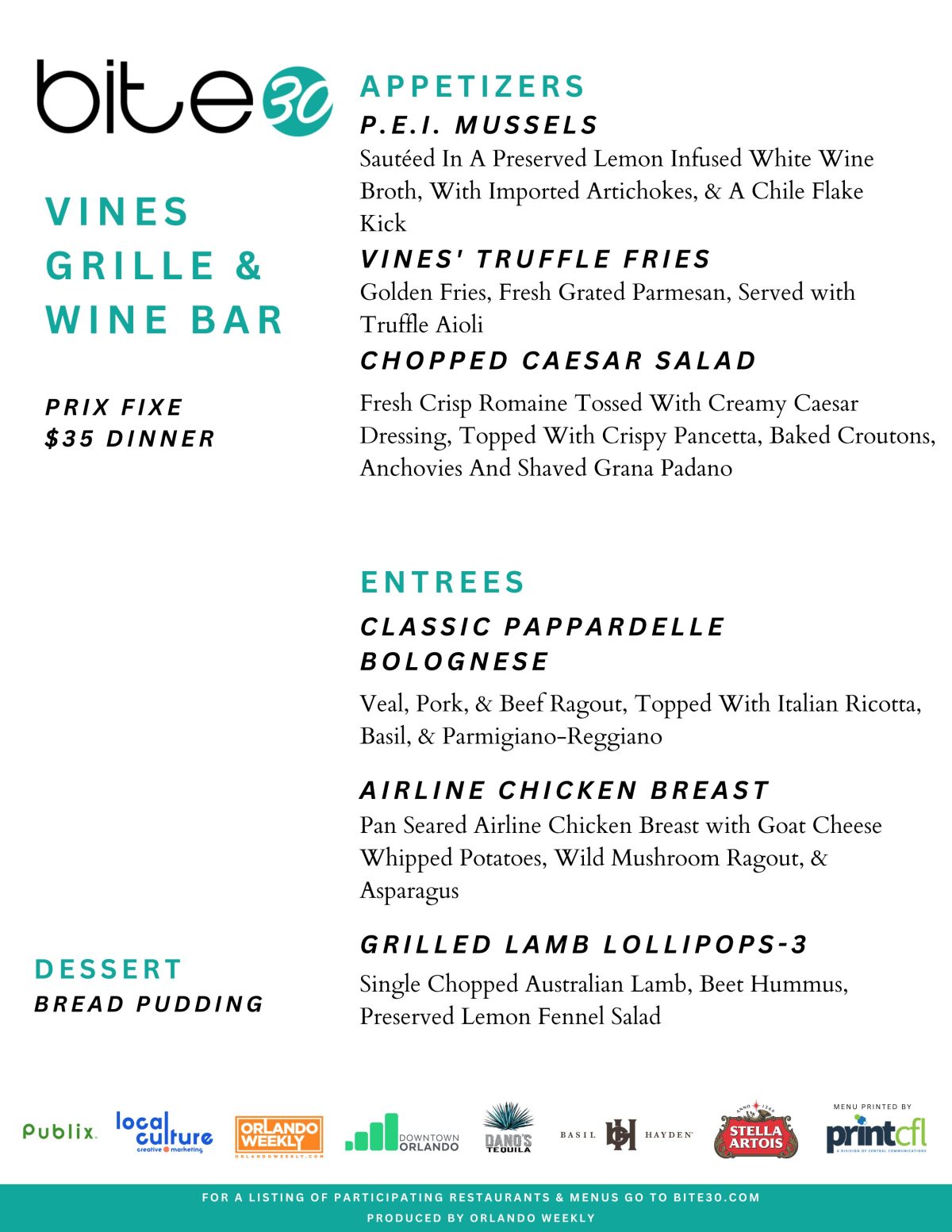 Join us for Bite30 in our Main Dining Room at Vines Grille & Wine Bar! Indulge in a $35 prix fixe dinner featuring delicious dishes like P.E.I. Mussels, Classic Pappardelle Bolognese, and Grilled Lamb Lollipops. Save room for our delectable Bread Pudding dessert