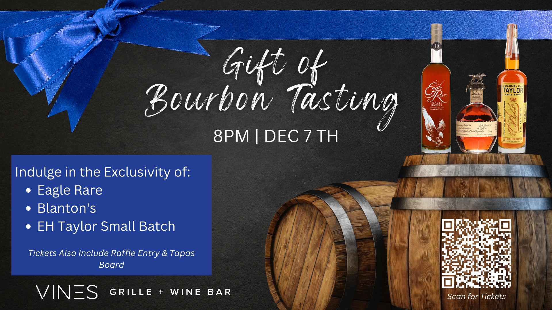Join us at Vines Grille & Wine Bar for an exclusive bourbon tasting experience on December 7th at 8pm. Dive into the world of fine bourbons with tastings of three highly sought-after selections: Eagle Rare, Blanton’s, and EH Taylor. This event offers the unique chance to secure rare bourbon allocations. Each ticket comes with an entry into a raffle for a coveted bottle of Stagg Jr and a delightful Tapas Board to complement your tasting journey. Engage with fellow aficionados and enjoy insights from Bourbon Society guest speakers in a sophisticated networking environment.